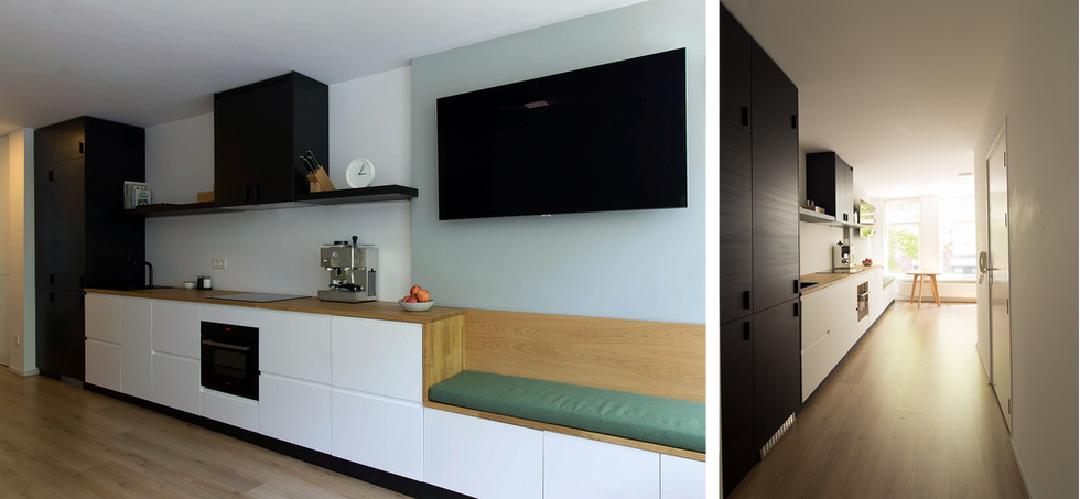 A continuous cabinet wall organize the space containing the laundry area, storage, kitchen space and a reading bench by the window. Helping the space feel bigger. Neutral colors with wooden accents keep the space clean and luminous. A sliding door divide the bedroom from the rest of the house Bringing natural light to the hallway when privacy is not needed.